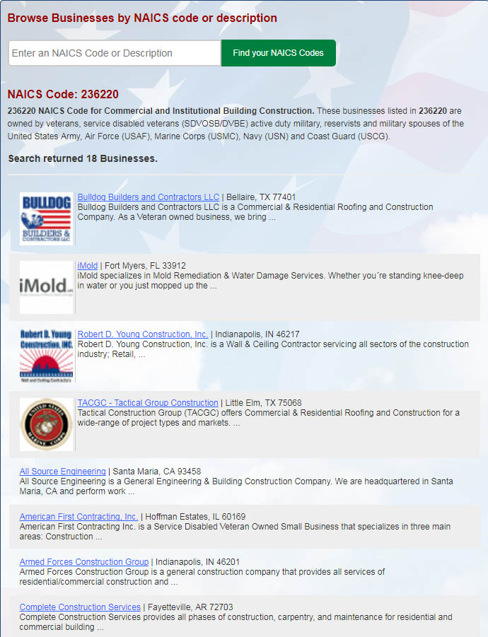 8 Additional Applicable NAICS Codes for a total of 10Add your business' NAICS Codes so government purchasers and contractors can find you in our exclusive NAICS Codes Directory and NAICS Codes Search Engine. Enhanced listing show above basic profiles and include your logo. Number (to the right) shows how many codes are alloted to each membership level.