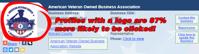 Logo on your VOB profileAdding a logo to your listing makes it more noticeable and increases brand awareness. It's also 87% more likely to be clicked! Don't have a logo readily available? We will set you up with your military branch seal as a placeholder. You can easily submit your logo at a later date.